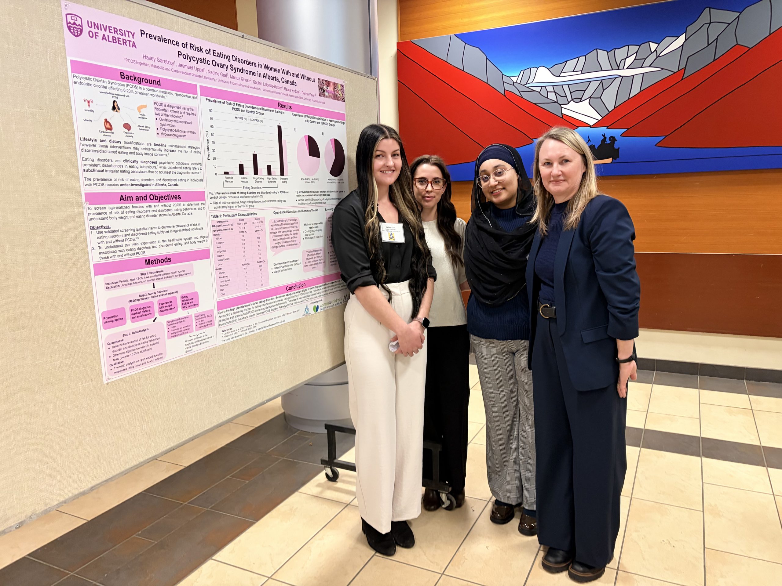 The PCOS Together Team presented their PCOS research study findings at the NUTR 450 Poster Symposium on March 26, 2025 at the Student's Union Building, University of Alberta.